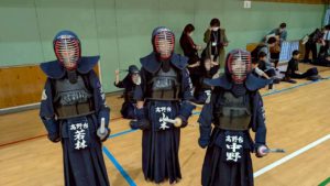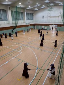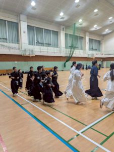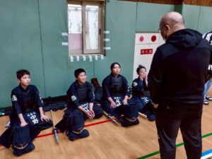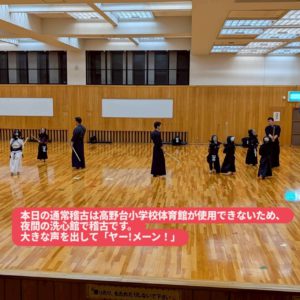 錬成会後、英真学園高校の先生方、OBOGの皆様、高校生の皆様に稽古をつけていただきました。子ども達は、我先にと面をつけてかかりに行こうとしますが、高校生の面つけのスピードが早く、乗り遅れてしまいました。
